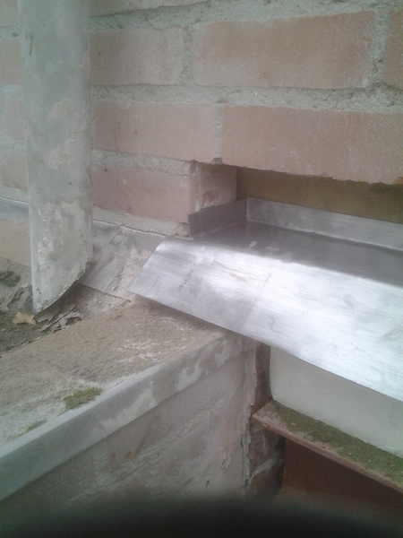 Lood geheel door de buiten muur aangebracht en gepatineerd (behandeld tegen corrosie)