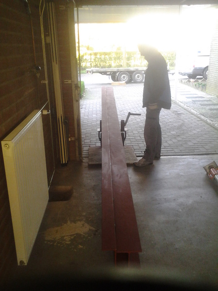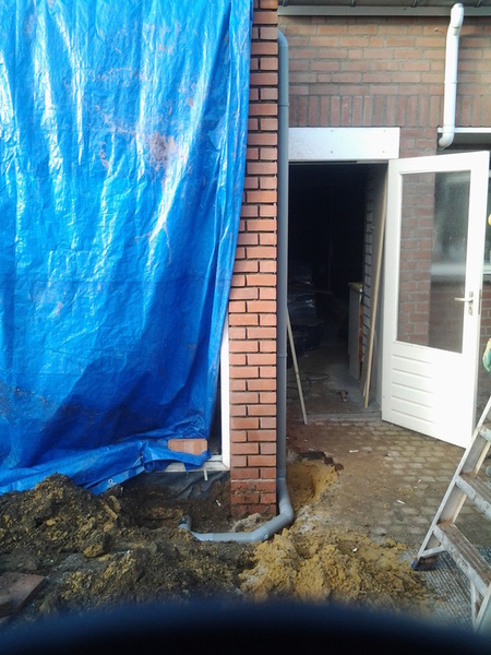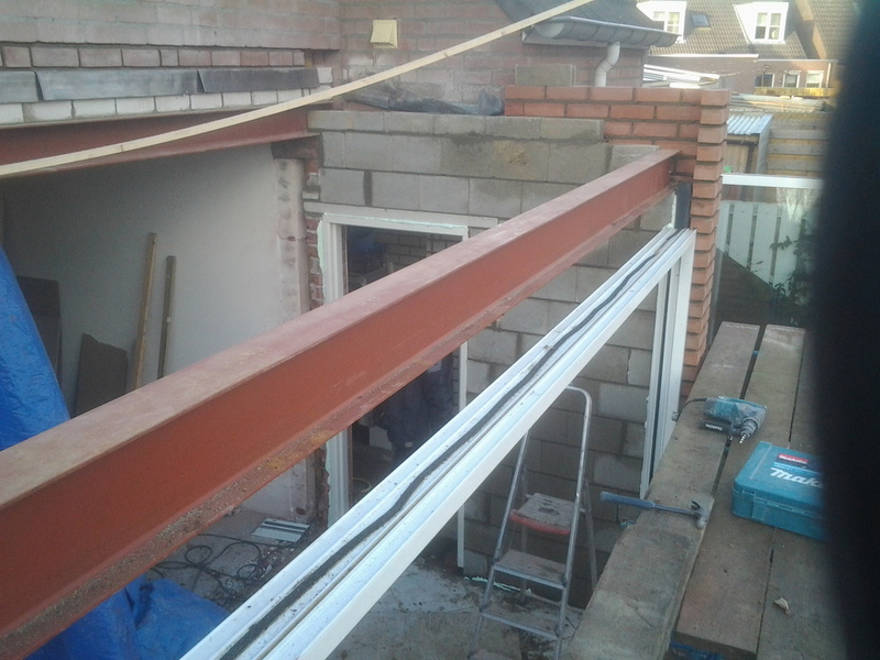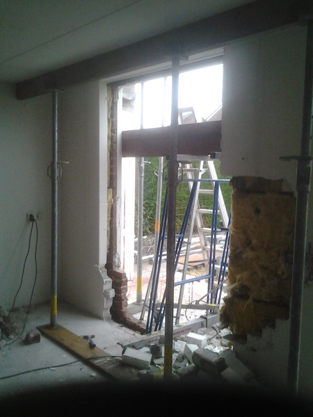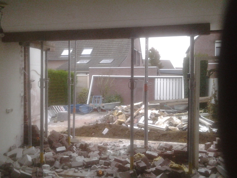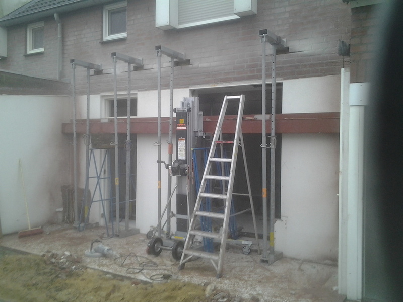 Plaatsen van staalbalk in achtergevel na goed stut-werk.