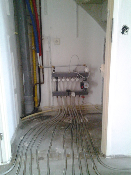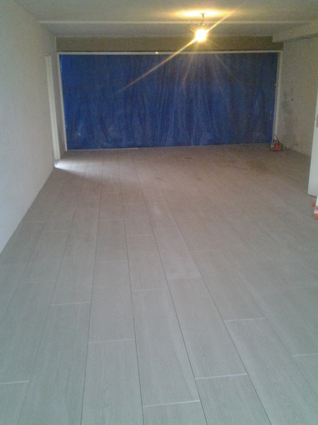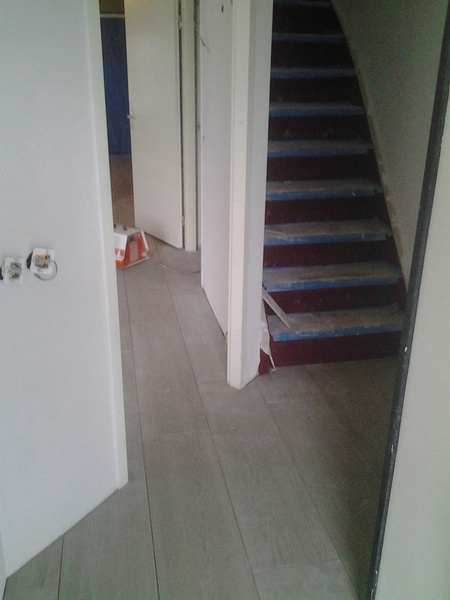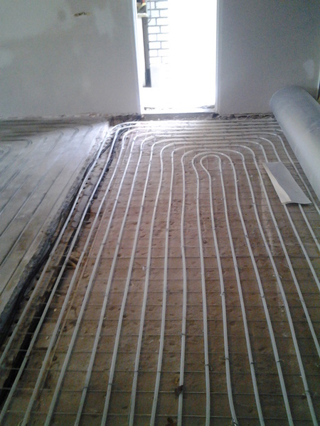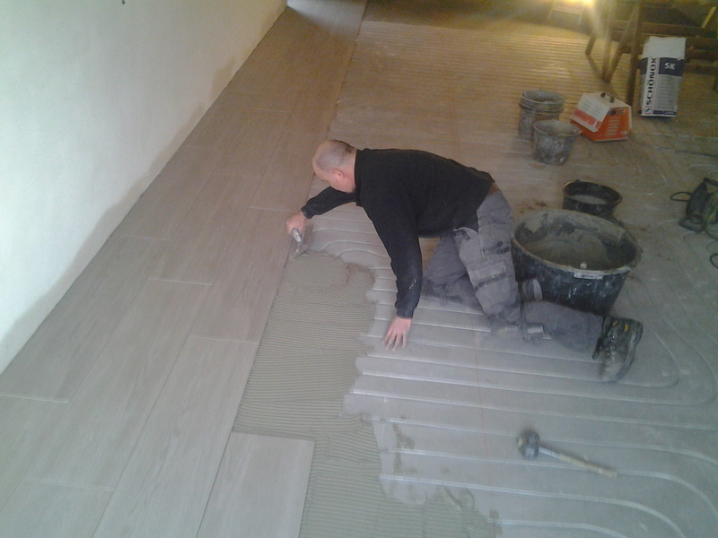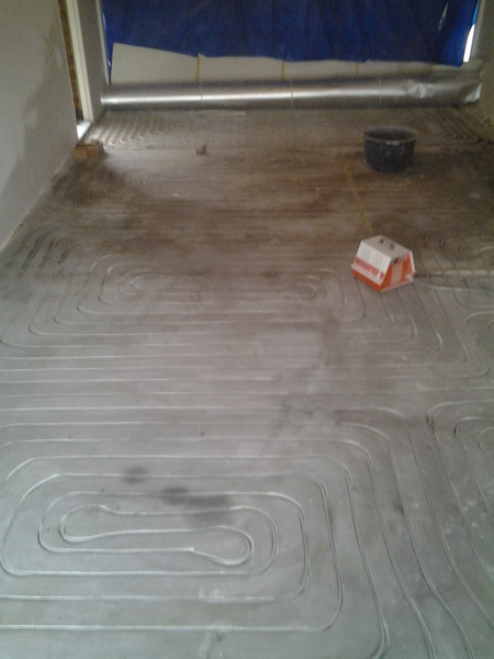 Vloerverwarming in bestaande vloer gefreesd, waarna de tegels konden worden gelijmd.